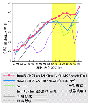 隔音中间膜的频率接近人耳最容易听到的声音频率(1000~4000Hz),因此,隔音中间膜与以前的中间膜产品相比,隔音效果提高了5分贝。