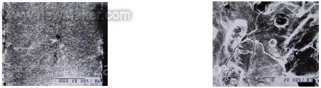 可锻铸铁连杆断口面均没有明显的铸造缺陷,疲劳源起源于工字筋的中心,扫描电镜(SEM)分析表明(图1 所示),工字筋的中心部位是铸造凝固后的枝晶组织及枝晶间显微疏松、夹渣/夹杂物,疲劳起源于疏松、夹渣/夹杂物处。