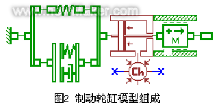 模拟单车轮ABS液压控制系统的一部分进行建模,模型组成如图1所示,选用两个两位两通比例电磁阀,如图1中3、5所示,对系统进行增压、保压和减压控制。图中2、4分别为电磁阀的增压和减压控制信号。部件1表示制动轮缸,其中包括一个液压缸,一个接触式弹簧阻尼系统对汽车轮缸进行模拟,其模型组成如图2所示。6为一个恒定压强的恒压源。