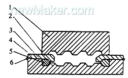 1.凸模 2.凹模 3.工件 4.翻边机构 5.胎模 6.铰链