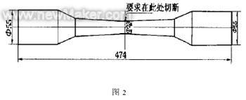 为了适应大批量生产,提高效率,我们确定了如下工艺:(中频炉)加热/(楔横轧)制坯/(25000k N热模锻压机)压弯/预锻/终锻/(3150kN双点压力机)冲孔/切边/正火/抛丸探伤/精压。在工艺流程中,加热制坯是采用一次两件,零件柄部细长,自由锻单件制坯效率低。采用楔横轧制坯(如图2示),同时在轧机上切断成两件。由于零件的截面变化较大,从∮55轧制到∮23,需两次起楔方可完成,所以轧制模具加工及修复难度较高。