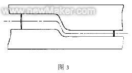 通常压弯模设计时只考虑压出的坯外形弯曲与锻件相一致。由于臂体大头与柄部的厚度相差较大,在放入预锻模时,弯坯柄部会悬空,预锻时,柄部与大头过渡处产生了折叠,由于弯坯柄部悬空,预锻时这部位的金属流动过大而造成。因此,压弯坯的设计必须使弯坯放在预锻模上,使其外形与预锻模的外形相符,如图3示。