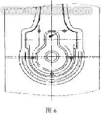 该模具制做难点之一就是5个∮6.2mm钉的位置度,考虑到电极在腐蚀型腔时,钉的损耗快,所以10个钉是在型腔电火花加工完成后再单独加工而且加工时,要用以锻件外形为基准的对模板来刘模后加工10个钉,从而保证了钉的要求。