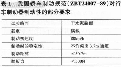 下面将根据相关的制动规范,确定制动器制动力矩的下限值。表1列出了我国的轿车制动规范对行车制动器制动性的部分要求。