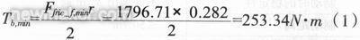 Tmin——前轮制动器最小制动力矩(N·m),见式(1);Tmax——前轮制动器最大制动力矩(N·m),见式(2);u——制动器摩擦衬片摩擦因数,取0.3;F0——制动驱动力(N);Re——等效半径(m)。