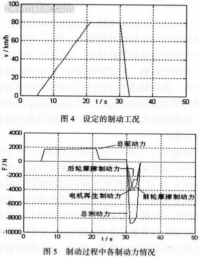 利用ADVISOR软件进行制动仿真试验,来确定前轮摩擦制动器的最大制动力。选定路面附着系数为0.8,设定的制动工况如图4所示。汽车先加速到80km/h,然后以a=0.8g的减速度进行制动。