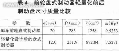 由表4显示,轻量化设计后,前轮制动盘体积由以前的1258cm3减小为872.04cm3,质量由以前的9.5233Kg减为7.5271Kg,质量减轻了20.96%。