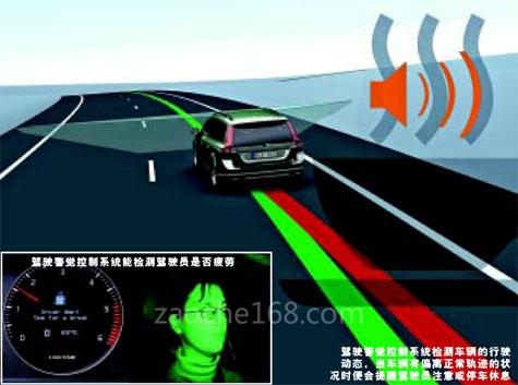 这套系统的硬件包括:一个位于挡风玻璃和内视镜之间的照相机,一些传感器,以及一个控制器。照相机用于测量汽车与车道标志线的距离,传感器记录下汽车的运行状况,这些信息将被传送到控制器,并由其来评估驾驶员是否处于失控驾驶的危险状态。