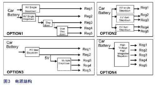 大多数系统电源的基本架构选择应从电源要求以及汽车厂商定义的电池电压瞬变波形入手。对于电流的要求应该反映到电路板的散热设计。表1归纳了大多数设计的电路及电压要求。