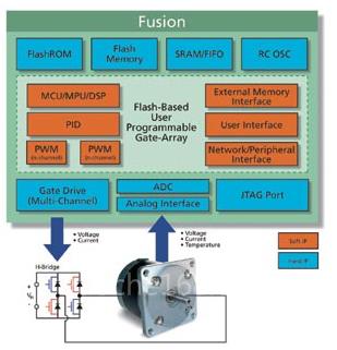 图2:Actel Fusion PSC能在单芯片上为运动控制系统实现前所未有的功能集成,将可配置模拟、大容量 Flash 内存模块、周全的时钟生成和管理电路,以及高性能的可编程逻辑全部集成在单芯片中。这个架构体系可与Actel的ARM或 8051软核和其它针对具体应用开发的IP核 (如脉冲宽度调制器) 同用。