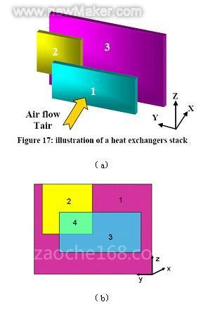 如图2(a)所示,假设部件1为空调冷凝器,部件2为机油冷却器,部件3为散热器。三个部件相互平行的布置于发动机舱前端,迎风为X轴方向,根据三个部件的位置关系及大小,冷却风流道可以划分为如图2(b)所示的四个区域,每个区域内的流动与传热状态均不相同,即使在同一区域内,受散热器内部流道形式的不同,其表面热分布也非常的不均衡。HEAT库为工程师提供了一个完备并且简单易用的工具,充分考虑这些因素的影响,使发动机舱的流动与传热分析、结构优化设计变得简单可行,最终结果能够满足整体设计要求。