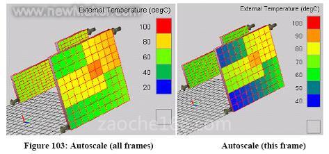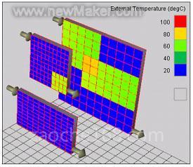 图10为应用AMESim的HEAT库进行仿真计算后的结果,可见散热器表面温度分布的不均衡性,在区域4(三个散热器重合处)温度最高,区域2、3(两个散热器重合处)温度较低,而区域1处温度最低,即使是在区域1,由于散热器内流动形式的不同,其温度也并不完全一致。