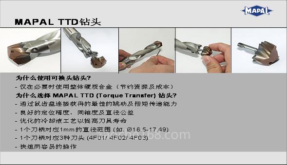 2,TTD钻头:对于整体硬质合金钻头来说,随着硬质合金材料价格的不断上涨,材料成本的压力越来越大。因此MAPAL研发了TTD钻头,这是一种钢制刀杆组合硬质合金刀头的钻头,通过TTS的鼠齿盘接口连接,能保证良好的扭矩传递及自定心性能。同整体硬质合金钻头相比,有着同样的性能,但成本大大降低。