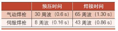 相对气动焊枪, 伺服焊枪的渐进和预压过程是影响焊接效率的两个关键阶段。可编程电极行程和速度可以缩短同一工位上多个焊点的渐进时间,也可以提高焊接生产率。以预压为例进行分析,图2 所示为气动焊枪和伺服焊枪在焊接过程中电极力的变化,假定达到设定预压力,电极力将保持恒定。如表所示,伺服焊枪焊接的一个焊点可节省0.44 s, 以一台轿车约3 500 ~5 000 个焊点为例,将节省26 ~37 min 的焊接时间,生产率得到极大提高,车身焊装线的生产能力大大提升。