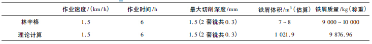 2个工作天窗作业后,根据铁屑占铁屑仓的高度比例,大致估算出铁屑的质量和体积,然后通过运输带排出铁屑,过磅称出铁屑的质量( 铁屑回收为炼钢的原料) 。表2 是理论计算结果和上海铁路维修基地使用林辛格生产的铣磨车加工钢轨得到铁屑数据的比较。