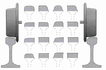 标准钢轨截面界面( 见图2) 使用一段时间后轨头形状就会出现改变( 见图3) 。这就会加速钢轨不均匀磨损、破坏,甚至导致车辆故障和行车事故。2010 年6 月颁发的《高速铁路钢轨养护维修实施细则( 试行) 》中规定: 钢轨轨头的总磨耗= 垂直磨耗+ 1 /2 侧面磨耗。侧面磨耗在钢轨踏面( 按标准断面) 下16 mm 处测量( 见图4) 。60 kg 钢轨在