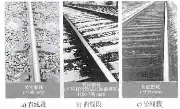 随着城市轨道交通发展规模的不断扩大,城市轨道交通的可持续发展问题已成为我国城市轨道交通发展战略的首要问题[1]。有效的钢轨维修和维护能够对城市轨道交通的可靠性、可持续性和安全性起到不可忽视的重要作用。同时,随着高速铁路的发展,铁路部门对钢轨轮廓质量的要求也日益严格,过去传统的检测和修护方法已不能满足铁路部门的要求[2]。钢轨的磨耗,比如侧面磨耗和波磨( 见图1) ,不仅造成了轨道运行时的噪声污染,而且增加了养护维修费用。利用钢轨铣磨车定期对钢轨进行维护,不仅能消除钢轨磨耗,同时也可清除钢轨表面的接触疲劳层,防止轨头剥落掉块,有效延长钢轨使用寿命,降低轮轨噪声,提高列车运行平稳性和旅客乘坐舒适度,有效降低运输故障率和事故率。