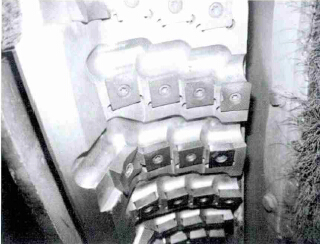 林辛格铣刀盘的一组成型刀由7 个刀片组成( 见图5) ,外加一个刀片对轨头轮廓以下小区域进行修整,目的是更好地巩固成型刀片修整效果。一次作业后,轨头的外形轮廓和收集到的铁屑见图6 及图7。