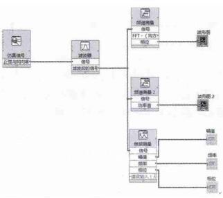 时域分析是在输入一定的条件下,根据输出时域表达式,以最直观的方法对物理信号时域波形来判断系统的稳定性、瞬态及稳态性能。其中包括特征参数及相关分析。频域分析通过傅里叶变换,以输入的频率为变量,分析特征参数与信号之间的关系。测试系统主要是功率谱分析、幅频和相频分析。功率谱密度:因加工中心工作台振动过程中产生大量的振动信号,信号中存在着大量的噪声,通过功率谱密度在不同的频率下的功率密度,从而能减少噪声带来的误差,功率谱包括自功率谱和互功率谱。幅频分析:输入和输出的幅值比 B/A。相频分析:相位角 φ 随频率 ψ 的变化波形。本系统输入的为正弦信号。滤波程序后面板框图,如图 3。