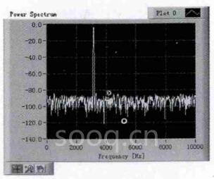 使用该振动测试系统 对加工中心进行振动信号分析、处理。此次测试实验,首先设置采样频率、采样通道和采样点;再点击开始采集按钮。其测得的功率谱如图 5 。与传统仪器测得数据一致,其余的图谱也一致,不再例举。此振动测试系统用仿生信号加以模拟,创建了一个叠加了正弦波和均匀白噪声的仿真信号源,选择数字滤波器(无限冲激响应),其优点:冲击响应无限持续,不会衰减。运行结果数据一样,证明此振动程序功能可靠,比较完善。