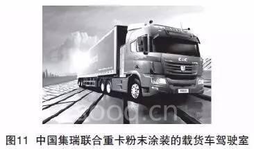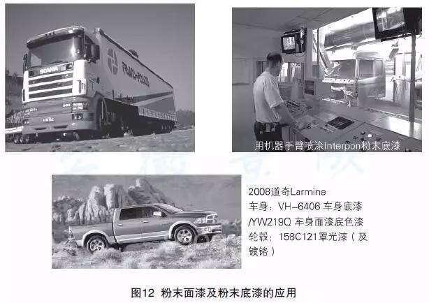 在中国集瑞联合重卡的粉末涂装线上涂装的载货车驾驶室见图11。将Interpon粉末做为汽车车身涂装的底漆层时,可以提供卓越的耐腐蚀性能和抗石击性能,已在美国(Chrysler)和欧洲(Scania)获得应用(图12)。