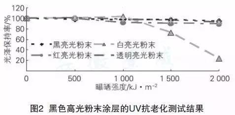 从图2见,经氙灯照射后,不同颜色涂层的光泽保持率有所差异。这是由于同种树脂制成的颜色不同的粉末涂层对光的吸收率和反射率不同而造成的。