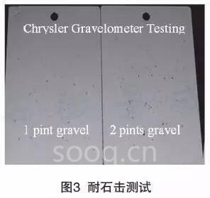 耐石击测试按SAE J400进行。OEM汽车生产厂要求户外装饰件都要通过该测试,见图3。图中所示样板的涂层体系如下。