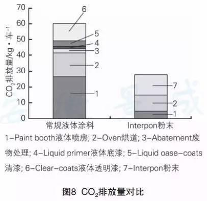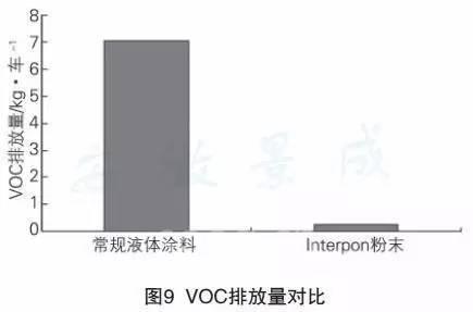 粉末涂装与其他液体涂料涂装相比,CO2减排60%以上(图8),VOC减排95%以上(图9)。