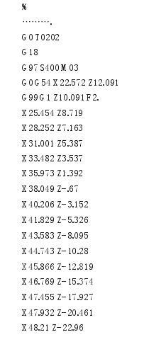 过程中的走刀路线不是直线,取决外圆轮廓的形状,所以需要进行补偿;进刀参数中根据零件的形状采用允许双向下刀的进刀切削设定,自动生成走刀路线和程序。从编程思路看出需要将螺纹加工的程序段中的G1%用G32%替换,如该零件第一刀螺纹切削程序,螺纹起始程序段G99G1 Z10.091 F2. 修改成 G99 G32Z10.091 F2 后就可以加工,精修次数为几刀就修改几个程序段。