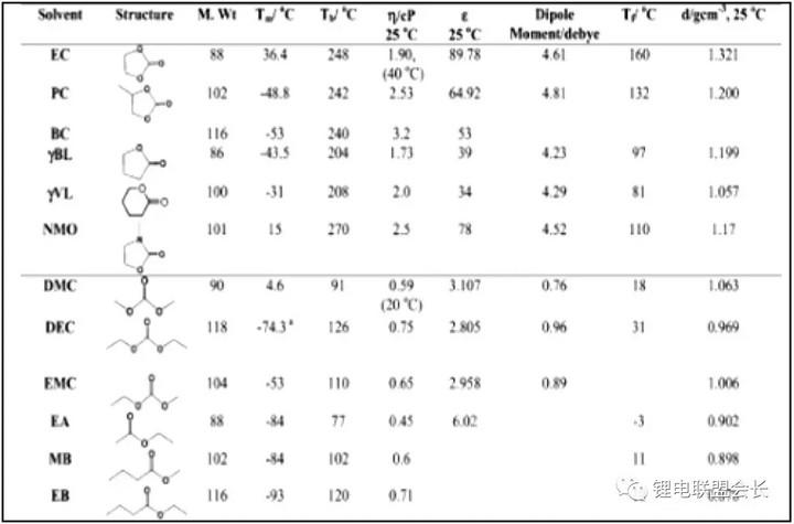 常见溶剂的物理性能如上表所示,根据电解液的选择原则以及所在的体系中选择合适的溶剂,基本的溶剂有环状、链状以及羧酸酯系列。