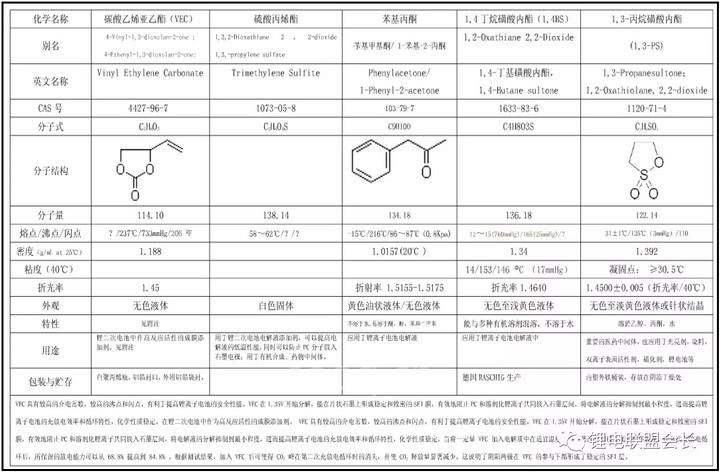 (1)成膜添加剂:VC应用的比较广泛,其主要机理为碳负极表面发生自由基聚合反应,生成聚烷基碳酸锂化合物,从而有效抑制溶剂分子的共嵌入反应;PS、ES、DES、DMS等物质,其主要机理为还原分解形成SEI膜的主要成分是无机盐Li2S、Li2SO3 或Li2SO4 和有机盐ROSO2Li,大大增强SEI膜的稳定性;