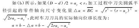 图中 A 为刀尖圆弧顶点,当主偏角 kr= 90° 时,刀尖圆弧顶点A 可以满足被加工零件轴向尺寸的精度要求。如( a) 所示,如果( D - d) /2 = ap> r,加工过程中刀尖圆弧半径将会导致被加工零件的轴向尺寸出现变化,将变化量记为△a,则△a = b - a = r,其中 a 表示刀具的实际轴向位移尺寸,b 表示被加工零件的轴向尺寸,r 表示车刀刀具刀尖的圆弧半径。
