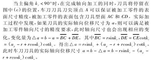 图中 A 为刀尖圆弧顶点,当主偏角 kr= 90° 时,刀尖圆弧顶点A 可以满足被加工零件轴向尺寸的精度要求。如( a) 所示,如果( D - d) /2 = ap> r,加工过程中刀尖圆弧半径将会导致被加工零件的轴向尺寸出现变化,将变化量记为△a,则△a = b - a = r,其中 a 表示刀具的实际轴向位移尺寸,b 表示被加工零件的轴向尺寸,r 表示车刀刀具刀尖的圆弧半径。此时的 a即为刀具实际轴向位移尺寸,其值为 a = b - △a = b - r。