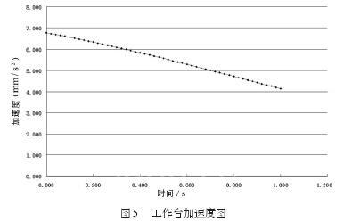 图 3~5 表明工作台在整个运动过程中位移、速度、加速度等的情况。在参数设置中设定了,如果发生运动干涉,运动将停止,从整个图表中来看,运动一直进行,没有干涉,运动良好。即没有发生运动干涉,设计合格,装配合格。如果存在干涉问题,可对模型进行修改,直到消除干涉现象。