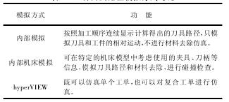 生成刀具路径后需要对其进行仿真模拟,以检查刀具、工件、机床、夹具和刀柄等各部分之间有无干涉碰撞。在 hyper MILL 中可以采用内部模拟、内部机床模拟和 hyper VIEW 三种方法对生成的刀具路径进行仿真。