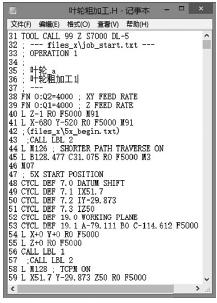 在 hyper MILL 中,利用后处理定制工具 hyper POST创建. oma 格式的后处理器,并对生成的 CL 文件和加工信息进行后处理,生成机床可识别的. h 格式的 NC加工代码。图 9 所示为叶轮粗加工的部分 NC 代码。