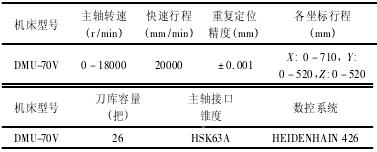 在 DMU-70V 五轴加工中心上完成叶轮零件的加工,机 床 的 部 分 参 数 如 表 4 所示。选 用 圆 柱 形 的Al7050 铝合金毛坯进行加工,其直径为 130mm,高度为