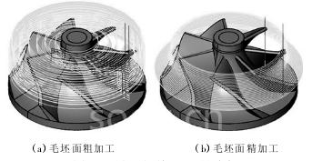 采用五轴联动的方式进行加工并选择绕 Z 轴的避让策略,以简化刀具的运动,使切削过程保持稳定。两次叶轮粗加工的刀具路径如图 6 所示。