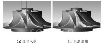 粗加工以去除多余材料为目的,加工出叶片的基本形状,所以应优先考虑提高加工效率。本文中的叶轮模型的相邻两叶片间的最小距离为 7. 5mm,若采用直径较大的刀具则无法加工到叶片的根部或者出现过切现象,若采用直径较小的刀具则加工效率太低。综合考虑,可采用不同直径的刀具进行两次粗加工的加工方式。在设置加工策略时,选择“型腔拆分”功能,对于没有短叶片的整体叶轮,导入侧较窄,用小直径的刀具加工,退出侧较宽,用大直径的刀具加工,如图 5所示。