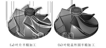( 1) 基于 hyper MILL 数控编程软件,利用叶轮加工模块对半开式整体叶轮进行数控编程。将整体叶轮的加工分为毛坯面预加工、叶轮粗加工、半精加工和精加工四个加工阶段,每一阶段包含对不同曲面的加工。其中叶轮粗加工分为两次加工完成,既避免了过切或欠切,又提高了粗加工效率。