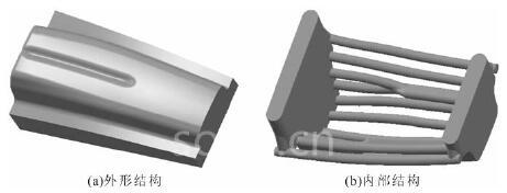 以某一款轿车热冲压模具为研究载体, 该热冲压模具的设计综合考虑计算机 CAD 参数化建模、热冲压及淬火仿真分析、 水冷模具管道设计及优化等科学问题。图 1 为一个典型车身模具镶块, 该模具具有复杂型面, 由于随形冷却水道要跟型面走向一致且要跟型面距离相等,所以冷却水道的结构也比较复杂。