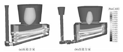 腰圆形冒口形状的设计, 可以起到标准圆形冒口相应的补缩作用, 图 5 所示为两种冒口设计中计算的最后凝固位置, 以看到最后凝固位置都位于冒口中。由于腰圆形冒口与模具形状相对应,可以减少冒口质量从而提高工艺出品率。通过比较计算结果中钢液流经内浇道时的速度, 可以发现在内浇道横浇道上做缓流设计可以减少钢液进入铸件的速度。