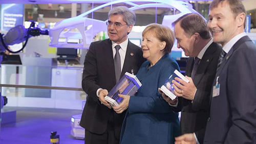※西门子CEO凯飒将采用增材制造技术打印的水晶雕像送给德国总理默克尔,在他们身后,是同样采用增材制造技术,并结合边缘计算、自主制造系统等尖端技术应用的汽车行业展示。