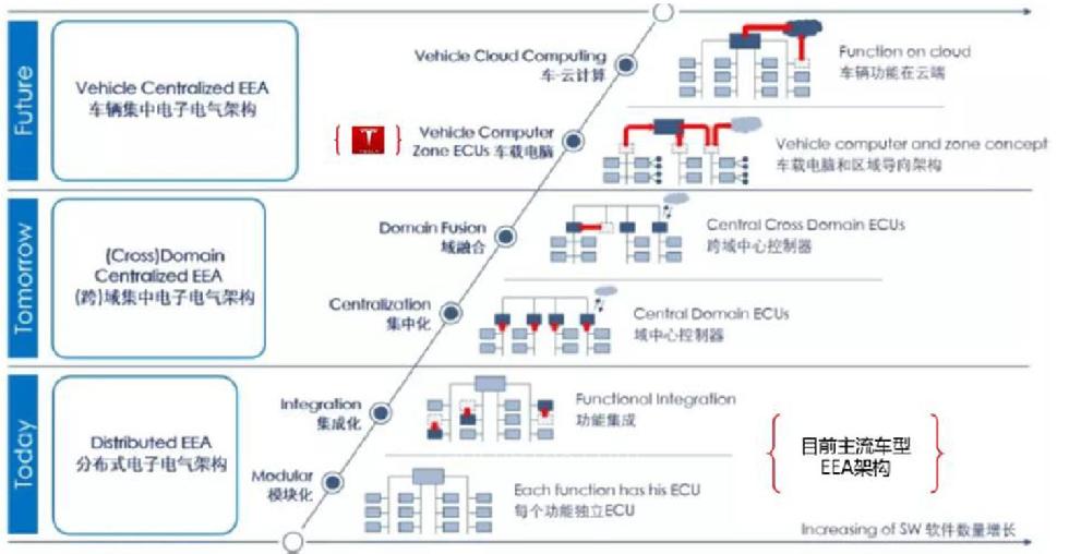 在目前大部分传统汽车采用的分布式E/E(电子电气)架构中,ECU在汽车发动机、变速箱、安全气囊等各底层执行零部件中广泛应用,承担决策功能。而在这样的架构下,要实现智能化功能的升级,就需要增加ECU的数量。