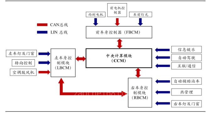 开源证券资料显示,在特斯拉Model3的架构中,配置有一个中央计算模块及三个区域控制器,这三个区域控制器分别为前车身控制模块、左车身控制模块和右车身控制模块。