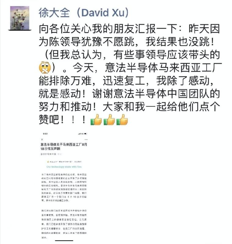 不过,仅在一天之后,徐大全就表示在意法半导体中国团队的努力和推动之下,位于马来西亚Muar的意法半导体封测厂的一个部门将在8月18日重启运作。