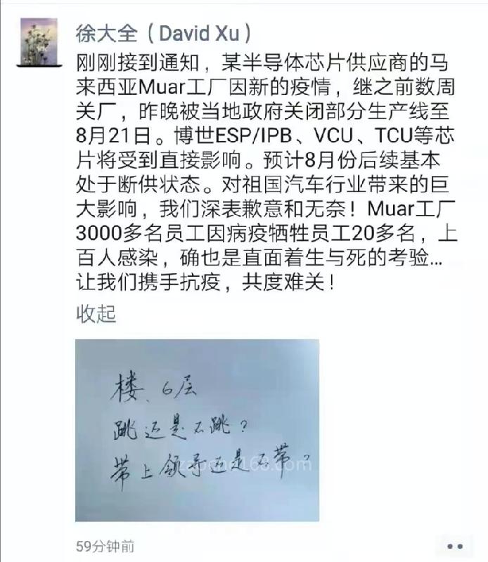 在博世高管发文的字里行间,坏消息的一面是马来西亚Muar工厂正在经历“生与死”的考验——3000多名员工里20名因疫情去世,上百人感染。而在另一面,芯片断供,则直接影响到诸多车企的“生死”,导致“祖国汽车产业大震荡”。