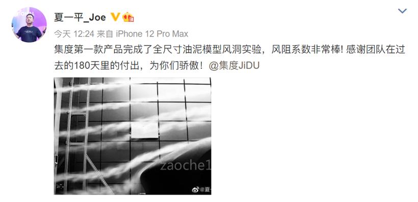 8月30日,百度旗下造车品牌集度CEO夏一平在微博发布首款汽车产品风洞图,并称:“集度第一款产品完成了全尺寸油泥模型风洞实验,风阻系数非常棒!感谢团队在过去180天的付出,为你们骄傲!”。