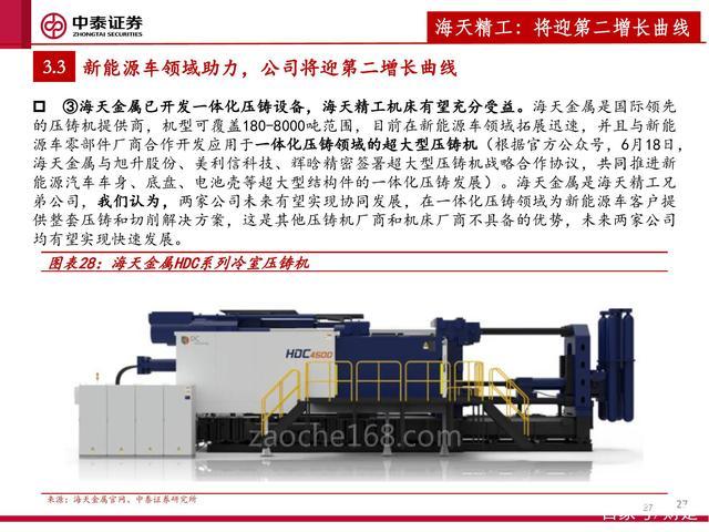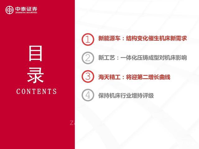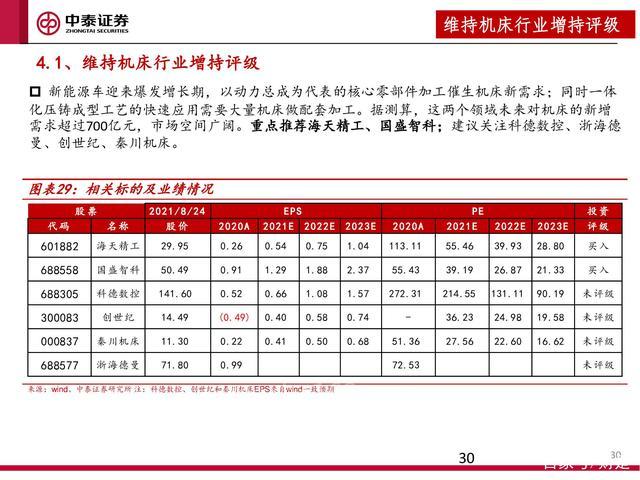 (2)一体化压铸工艺用于新能源车整车加工: ①台数:车身+侧门+尾门+座椅结构,需 要16台2000-8000吨级压铸机;②生产效率:假设生产一个结构件的时间为2-3分钟,一台压 铸机的年产能为10万件/年;③2000/4000/6000/8000吨压铸机分别配套15/18/20/25台龙门; ④新能源车年度销量参考中泰电新组的测算,即2025年国内新能源车销量可达800万辆左右。 测算可得,中国年产 800万辆新能源车对应机床(以龙门为主)总需求在440亿元左右,年均 为88亿元。预计从2022年开始,随着其他新能源车厂商逐步跟进推动一体压铸工艺,相关机 床需求将迎来爆发。