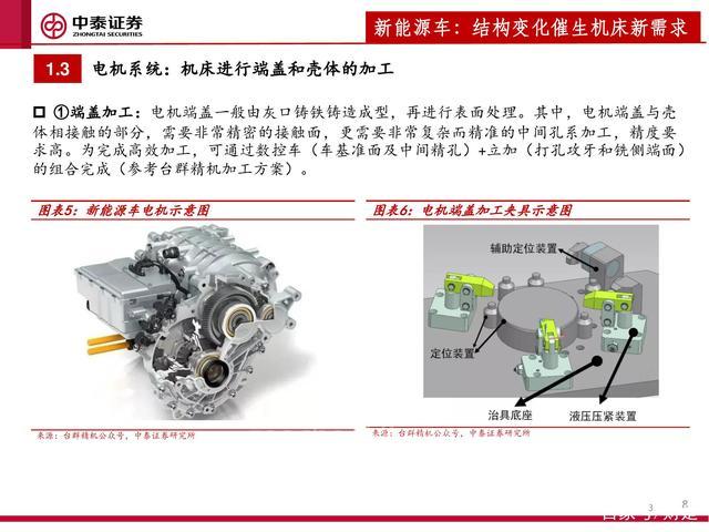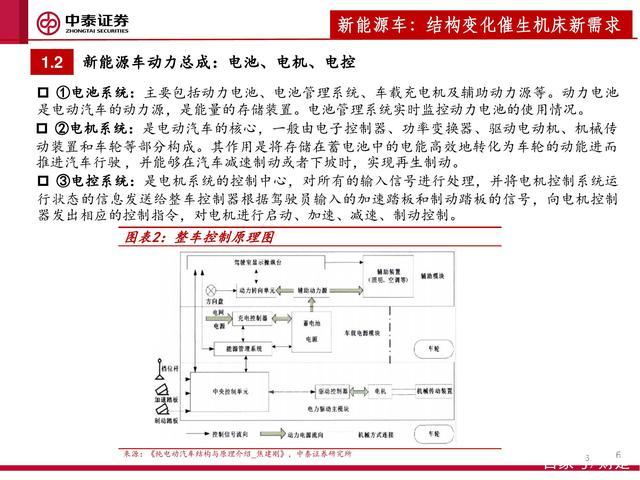 以纯电动汽车为例,由于采用电能作为动力来源,其动力总成较传统燃油车发生重大变化。 传统车主要由动力系统(发动机、燃油系统、排气装置)、传动系统、制动系统、汽车电子、 底盘、车身等组成。而纯电动汽车取消了发动机,传动机构发生了改变,增加了电源系统和 驱动电机等新机构,主要由动力系统(电池、电机、电控)、制动系统、汽车电子、底盘、 车身等组成。本章以下内容将以新能源车动力总成(电池、电机、电控)为例,分析其对机 床加工的需求。